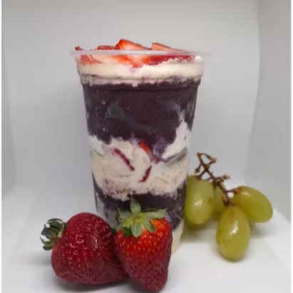 Açai cremoso, bem servido com morango, uva e creme de Ninho caseiro.