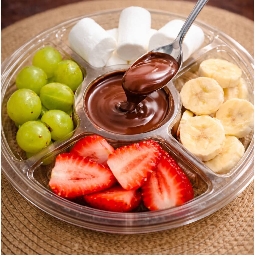 Uma combinação perfeita para dividir. Chocolate cremoso no centro com morango, uva, banana e marshmallow para mergulhar e aproveitar cada momento. Peça agora!