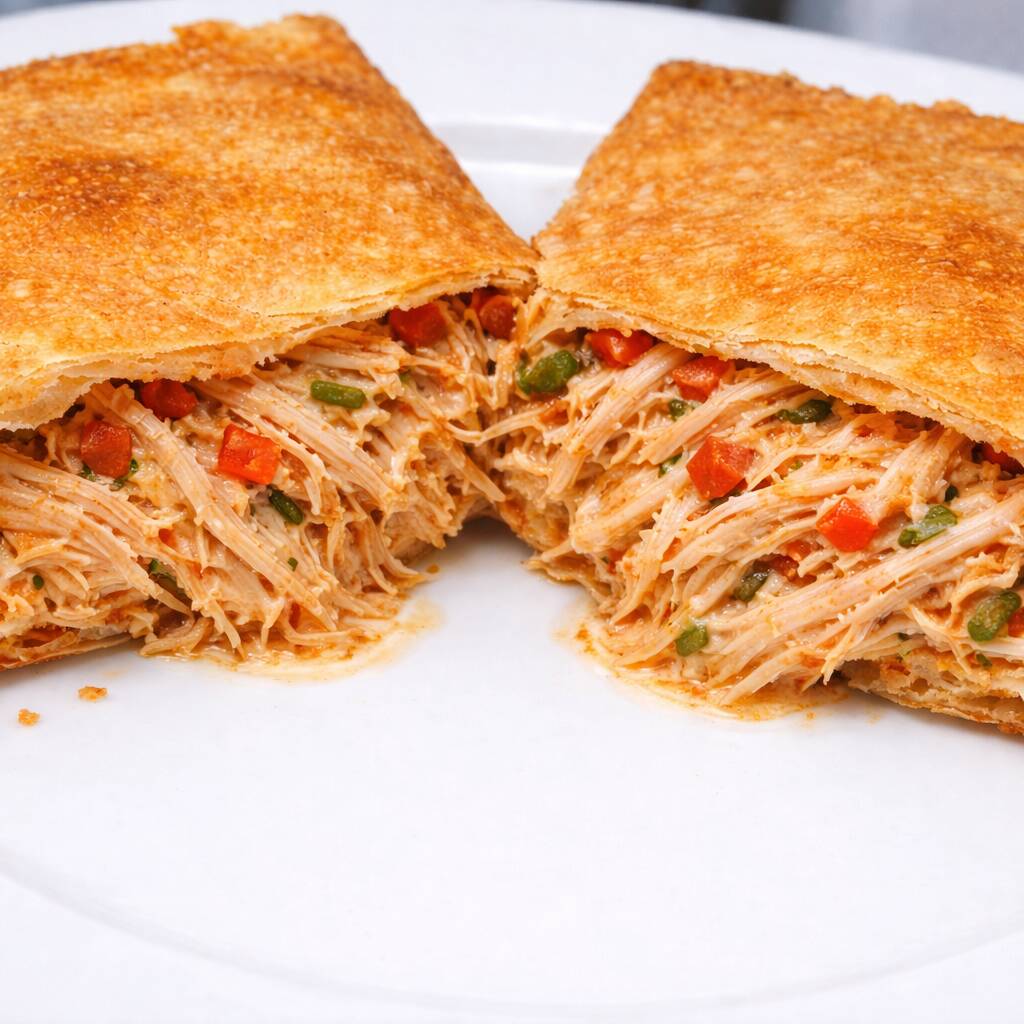 Coxinha recheada com frango desfiado e temperos especiais, envolta em uma massa crocante.