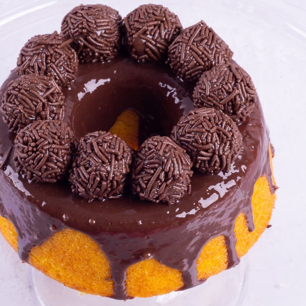 Todo nosso amor nesse bolinho de cenoura, com massa fofinha e cobertura de brigadeiro ao leite, com brigadeiros no topo do bolo.