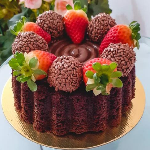 500g - Bolo com deliciosa massa de chocolate intenso e cobertura de brigadeiro cremoso, com brigadeiros e morango no topo para decoração, perfeito para um café da tarde!