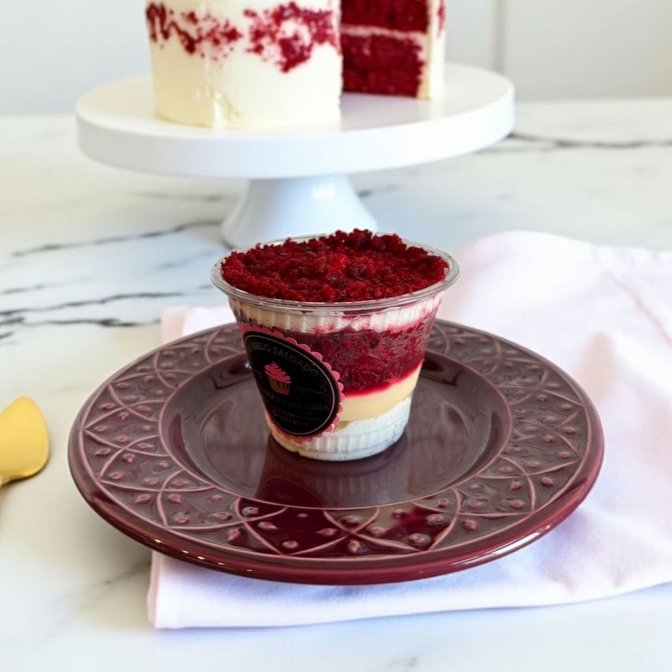 Mousse de leite Ninho ,brigadeiro branco ,chocolate branco e massa red velvet Não Mudou Nada Do Mini Copo Red Velvet Antigo Em Questão Dos Recheios … Só mudamos a apresentação …