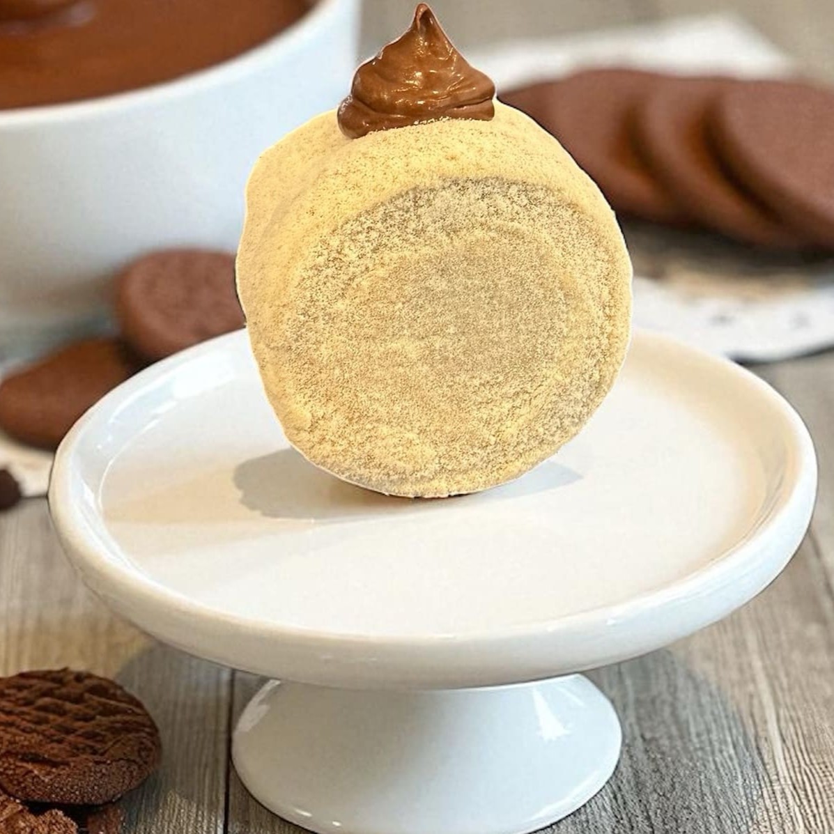 Cookie de chocolate recheado com brigadeiro de Ninho e Nutella pura . e coberto com brigadeiro de leite Ninho Ele não é gigante ... Ele pesa 60g (equivalente a 2 brigadeiros)
