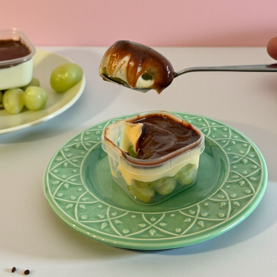 O Pote Tem 150ml (porção individual) . Ele é composto por uvas Thompson frescas, o nosso brigadeiro branco clássico divino mega cremoso e uma ganache de chocolate meio amargo (com chocolate nobre) Serve até 1 pessoa (aprox.160