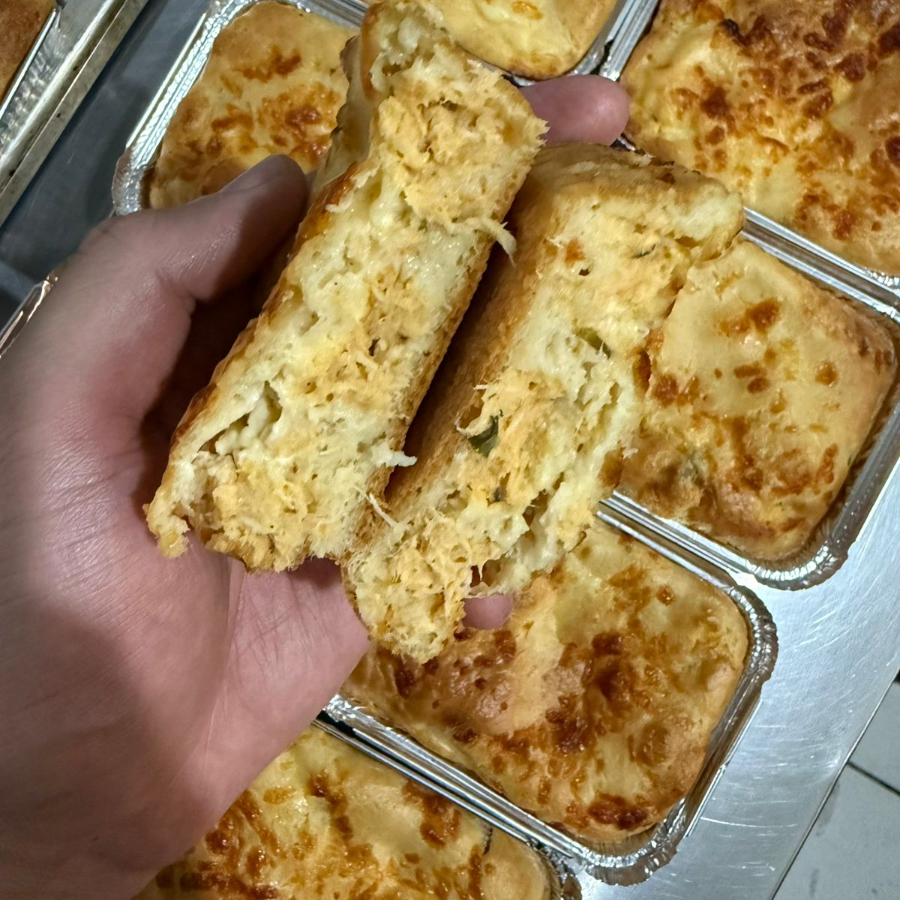 nossa quiche é perfeitamente cremosa fartamente recheada com alho poro e palmito , uma fatia de um tamanho otimo para uma pessoa