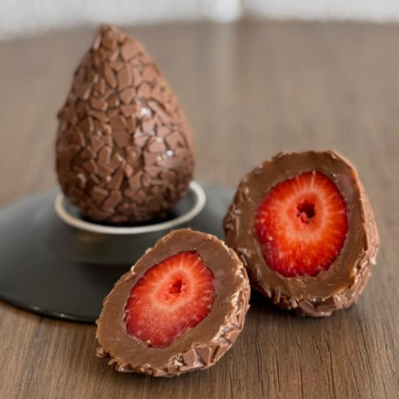 Brigadeiro ao leite ,morangos selecionados , e tudo isso envolto em granulado belga ( peso aproximado 80g a 90g)