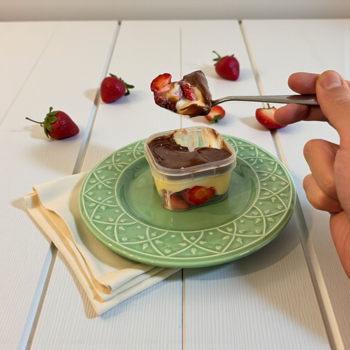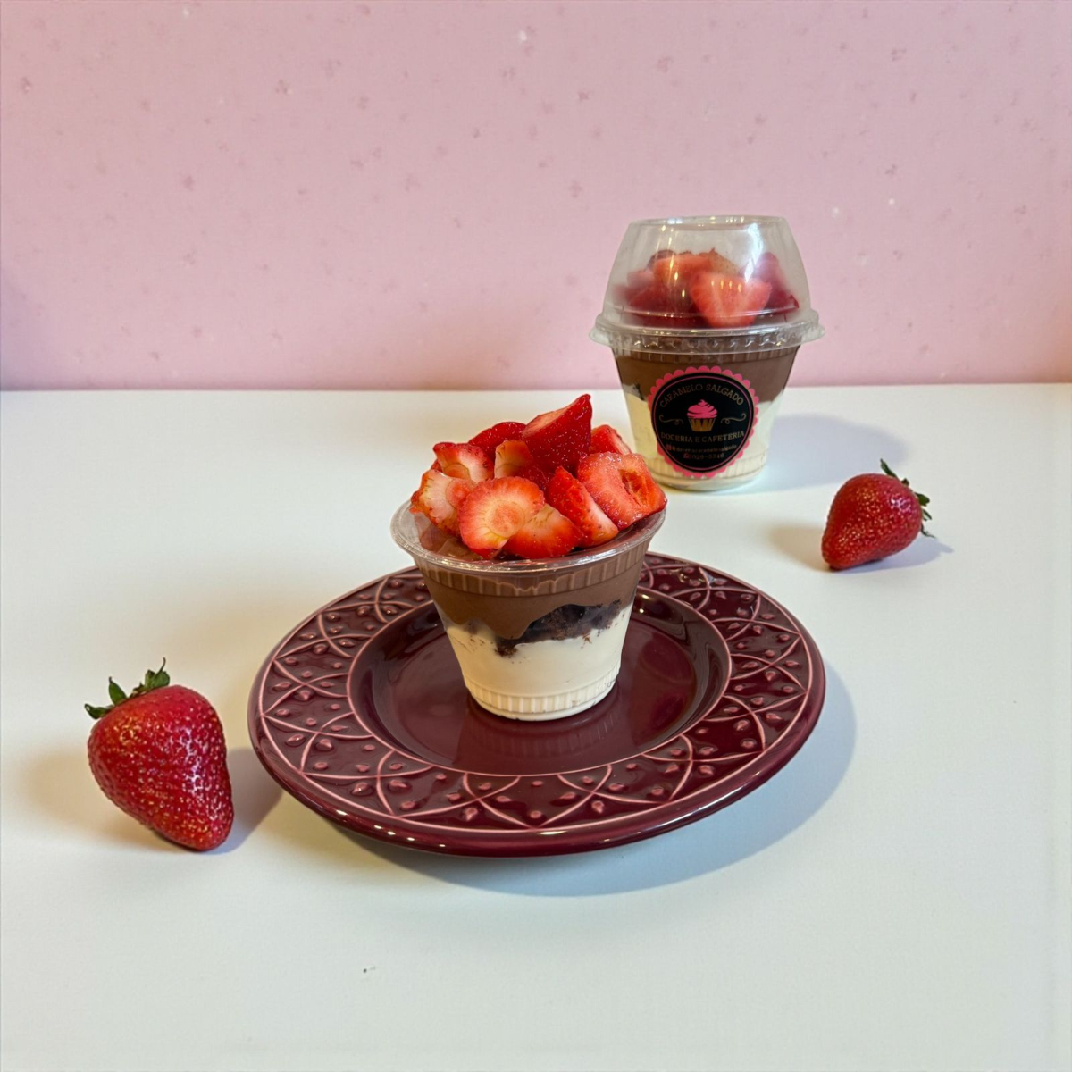O Pote Tem 150ml (porção individual) • Ele é composto por morangos frescos , o nosso brigadeiro branco clássico divino mega cremoso e uma ganache de chocolate meio amargo (com chocolate nobre)