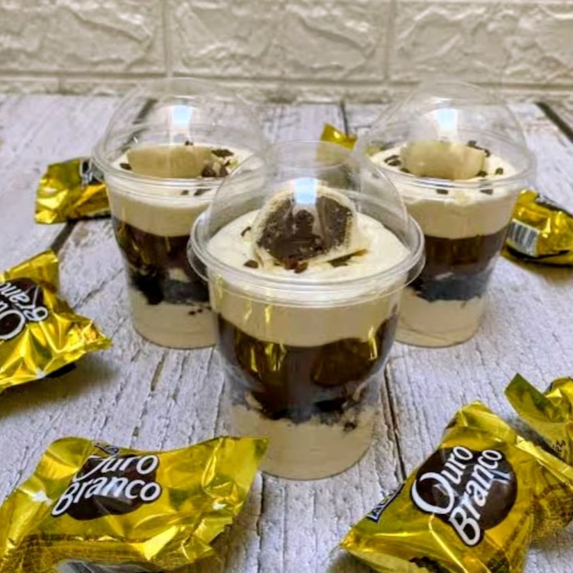 Bolo de pote de Ouro Branco massa preta ou branca recheio de creme de Ninho Ouro Branco picado uma camada de brigadeiro de chocolate