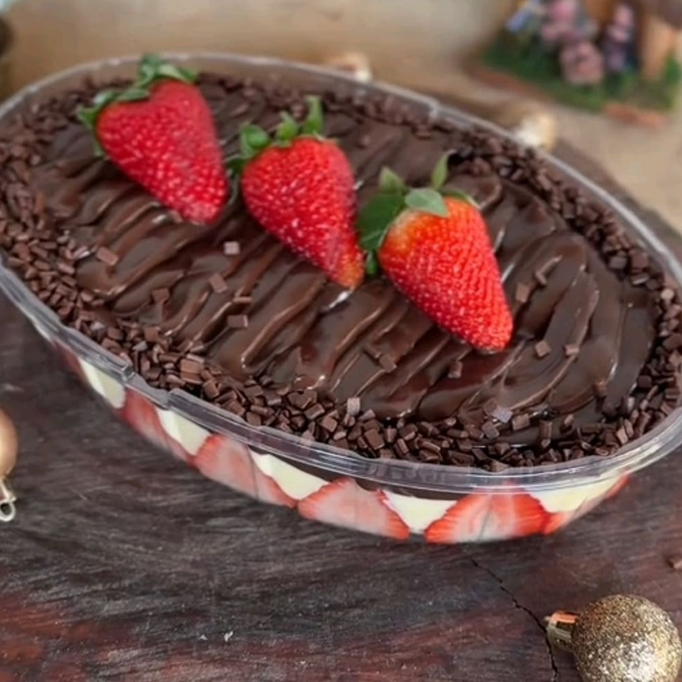 Uma verdadeira delícia em tamanho família essa sobremesa e feita a base de morangos frescos brigadeiro de Ninho e uma delicioso ganache de chocolate nobre meio amargo