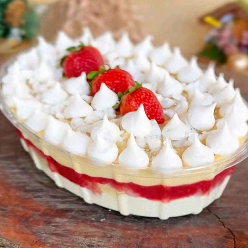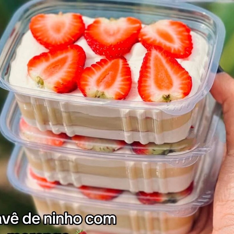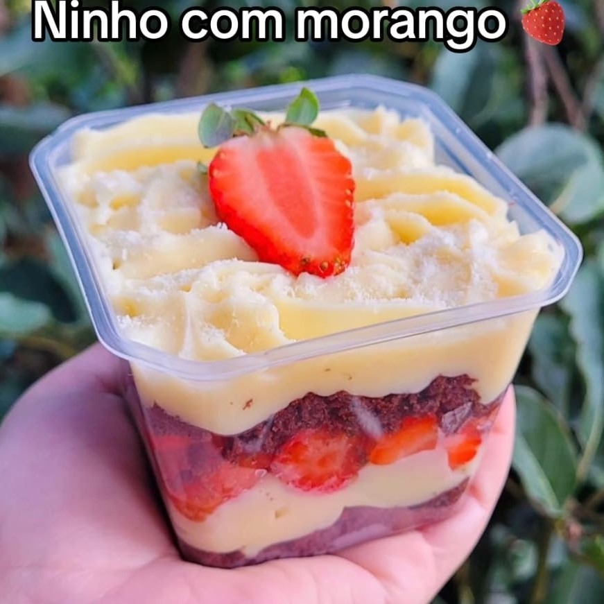 Essa sobremesa e uma verdadeira explosão de sabor chantyninho geleia de morango frescos brigadeiro de Ninho suspiros e morangos frescos tamanho de 600 ml serve 3 a 4 pessoas tamanho 1200 ml de 8 a 10 pessoas