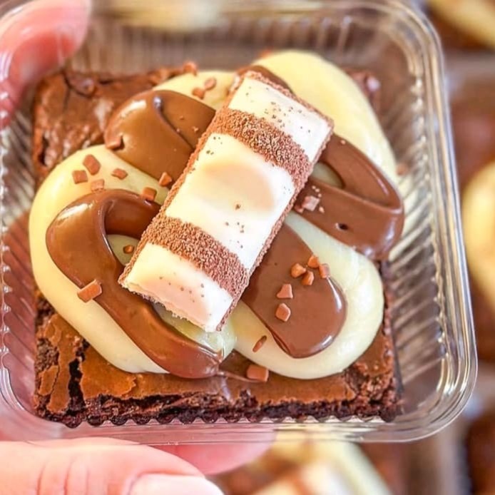 Uma deliciosa fatia de brownie com brigadeiro de Ninho Nutella Kit Kat e morango