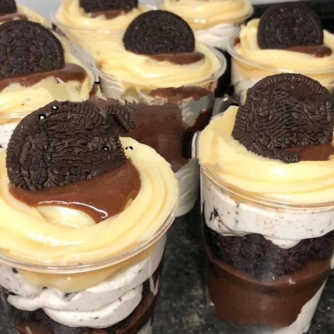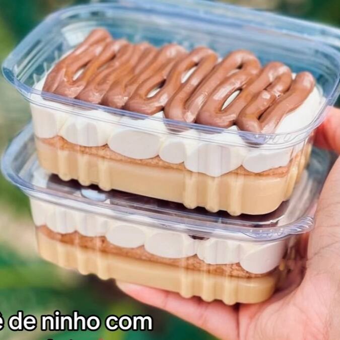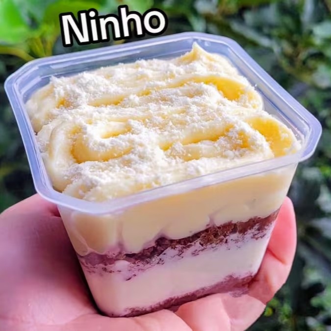 Bolo de pote e heado com mousse de Ninho e camadas de massa a sua escolha e camadas de brigadeiro de Ninho