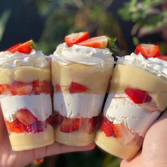 Uma verdadeira explosão de sabor camadas de creme Danoninho , chantininho geleia de morango e pra finalizar morangos frescos uma combinação perfeita