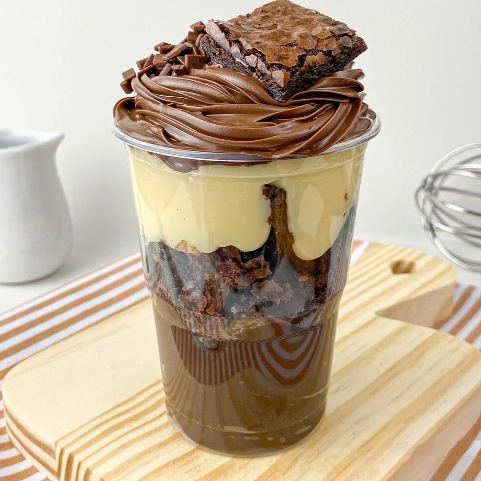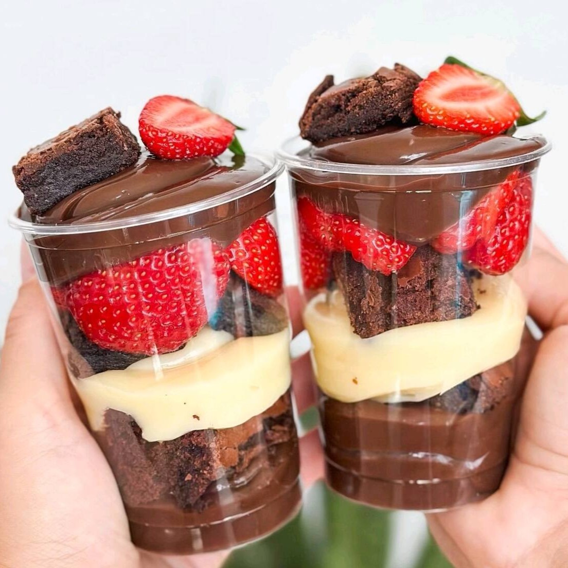 Nesta delícia vai camadas de brigadeiro de chocolate brownie picado camadas de brigadeiro de Ninho brownie morango picado uma verdadeira delícia