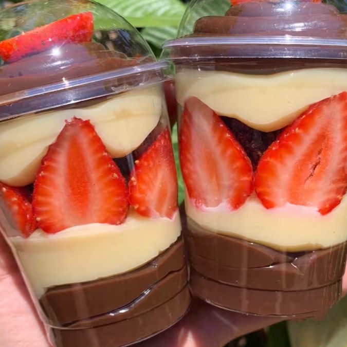 Bolo de pote de brigadeiro tradicional com morango nesta opção vc vai encontrar o sabor incomparável do brigadeiro tradicional com a leveza e o sabor incomparável do morango juntos formam uma explosão de sabor