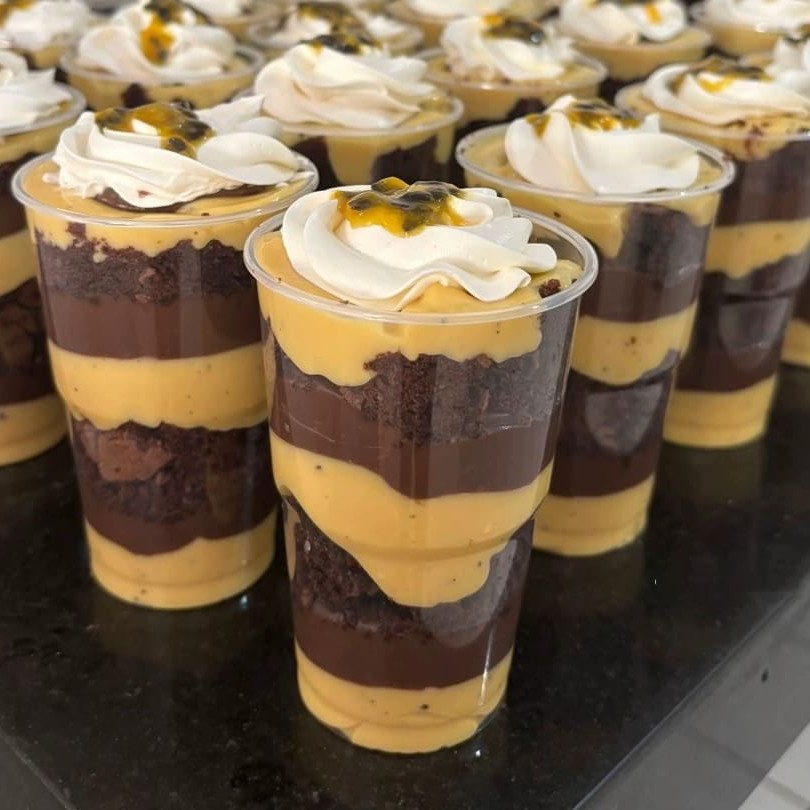 Uma verdadeira delícia esse copo vai uma camada de brigadeiro de maracujá com brigadeiro de chocolate gourmet