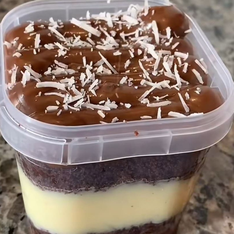 Um delicioso bolo de pote com camadas de creme de coco com bolo de chocolate e finalizado com brigadeiro