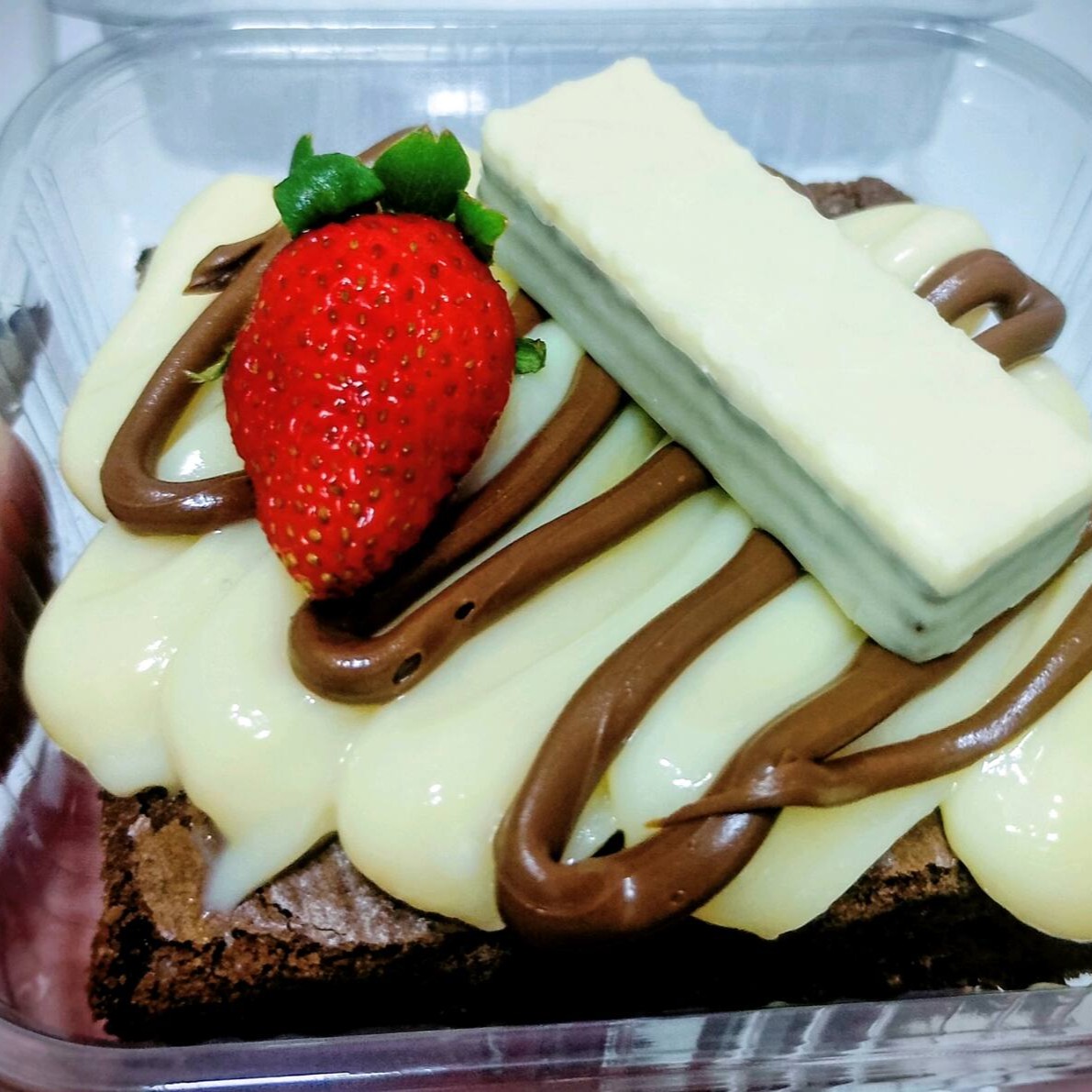 Uma fatia de brownie brigadeiro de Ninho com Nutella morango e Bis branco
