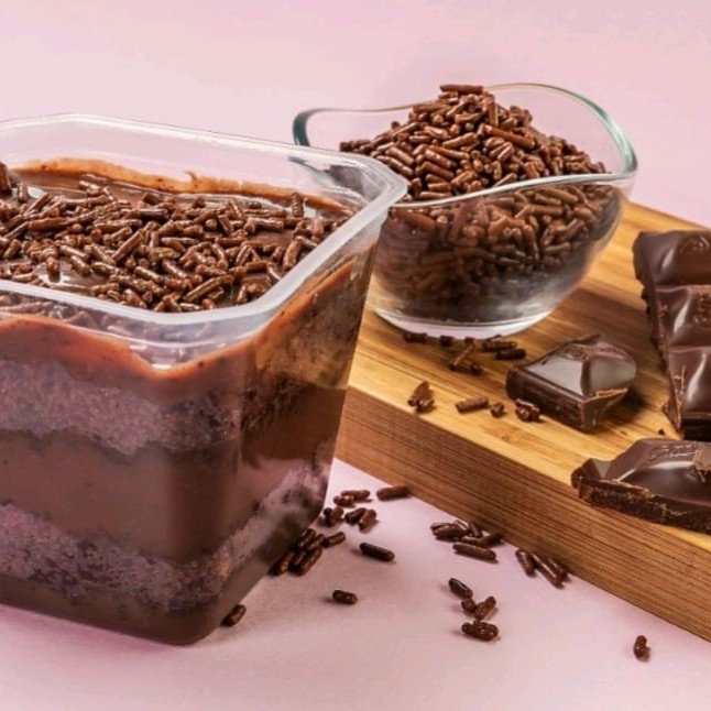 Um delícioso bolo no pote com camadas de brigadeiro de chocolate massa de chocolate brigadeiro de maracujá e finalizado com brigadeiro de chocolate