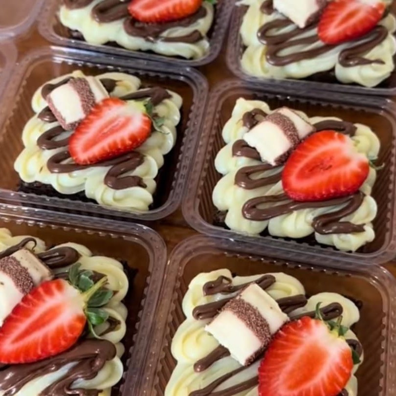 Uma deliciosa fatia de brownie com cobertura de brigadeiro de Ninho Nutella um bombom de Kinder Bueno e morango