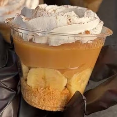Uma deliciosa tortinha feita numa porção individual O sabor de uma torta grande na medida certa Essa sobremesa Leva uma camada de massa de bolacha Doce de leite Bananas e finalizada com chantilly e canela