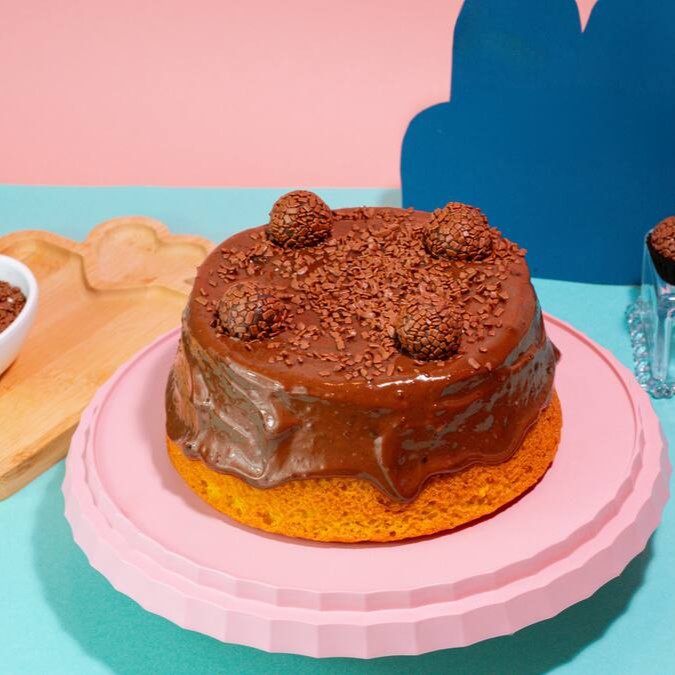 Deliciosa massa de bolo 50% cacau intercalada com brigadeiro cremoso de chocolate ao leite e brigadeiro cremoso branco, finalizado com Flakes belga.