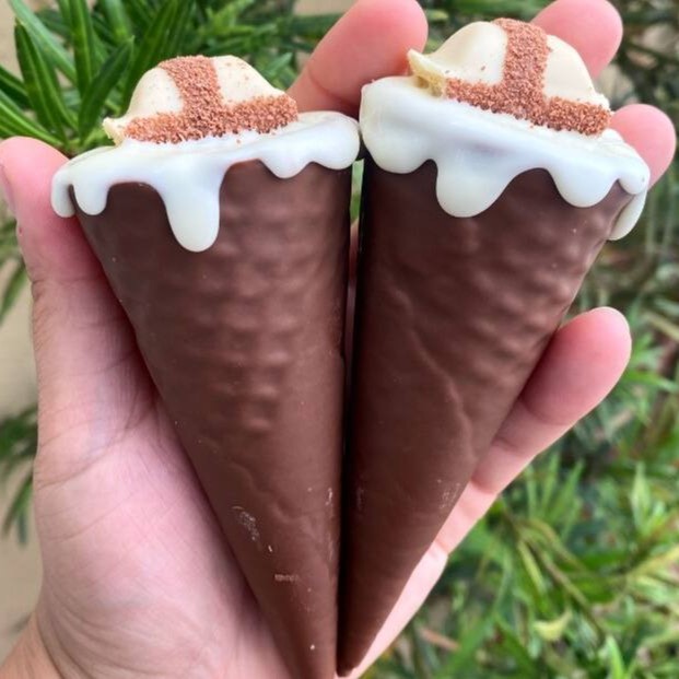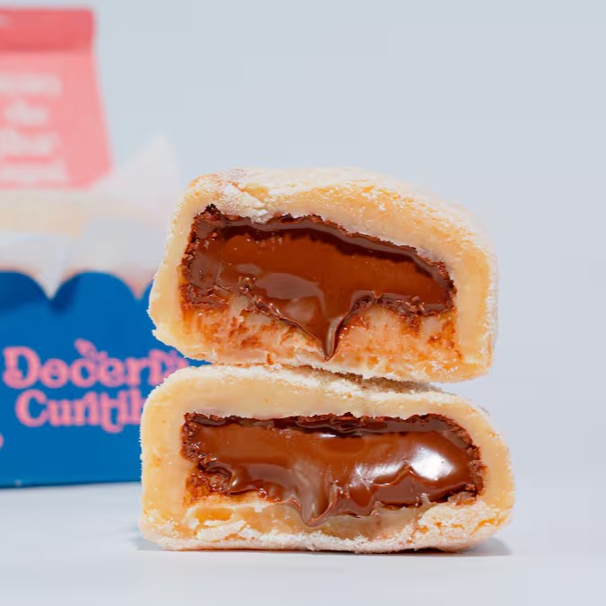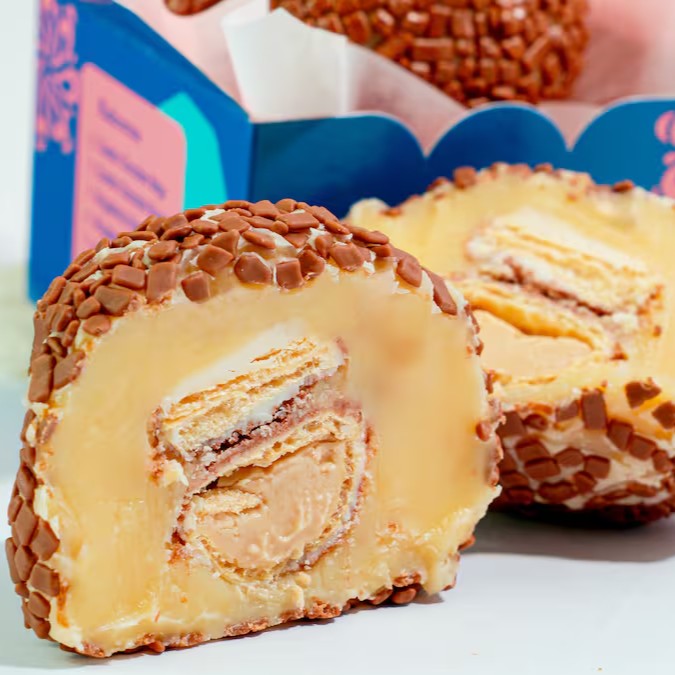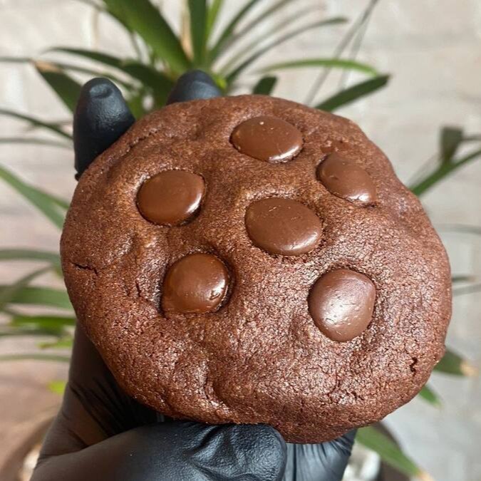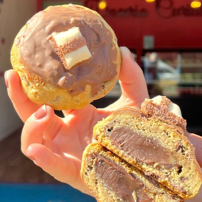 Massa de cookie deliciosa e crocante com gotas de chocolate, recheado com brigadeiro cremoso de chocolate, finalizado com Kinder Bueno.