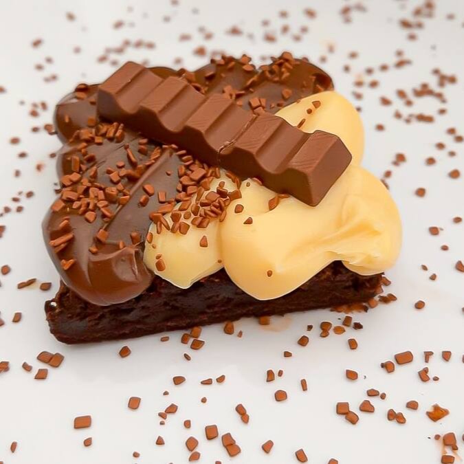 Brownie com brigadeiro branco e brigadeiro de chocolate ao leite, granulado belga e barrinha de Kinder chocolate.