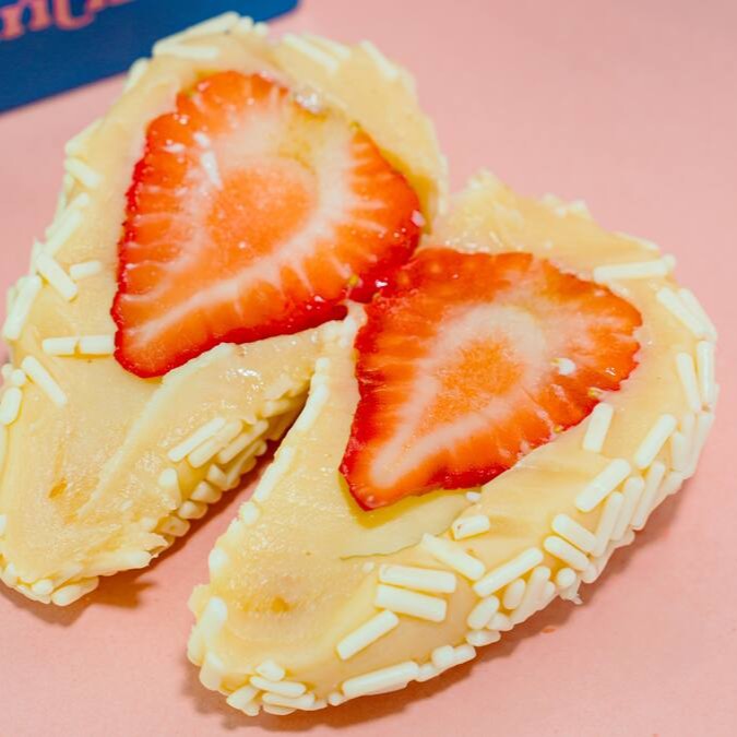 Delicioso brigadeiro branco, recheio com morango selecionado, envolto no granulado de Chocolate Branco.