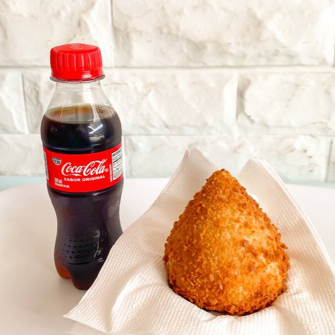 1 Deliciosa Coxinha de Frango com Catupiry Original, empanada na Farinha Panko, acompanhado de uma Coca-Cola de 200ml