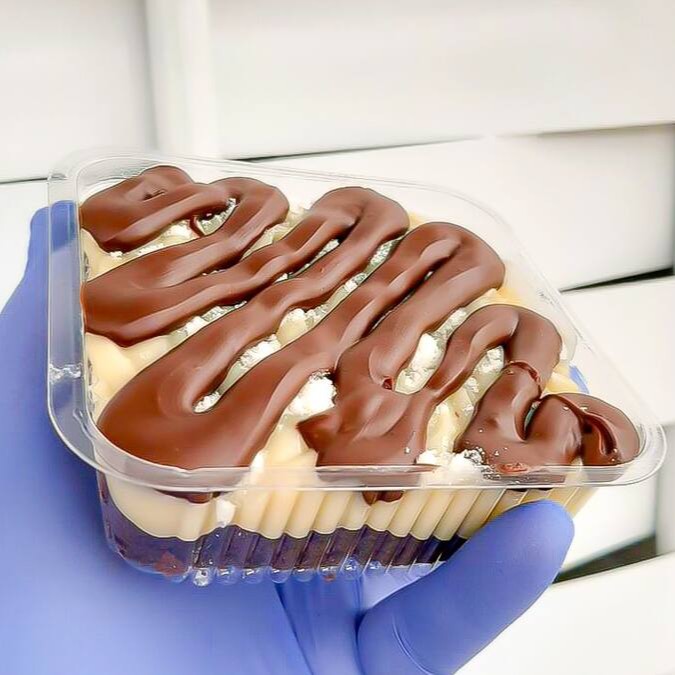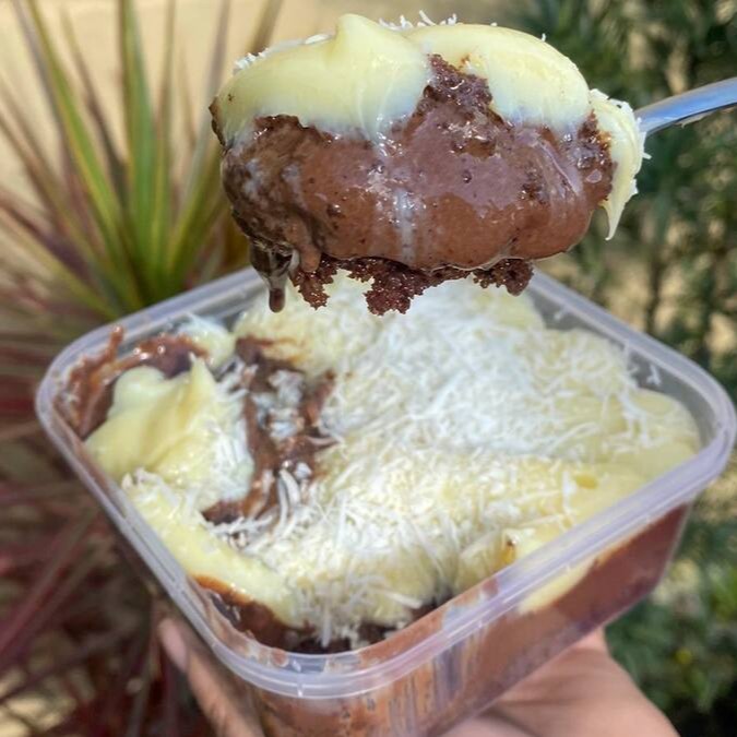 Brownie com brigadeiro branco e leite Ninho em pó, finalizado com Nutella.