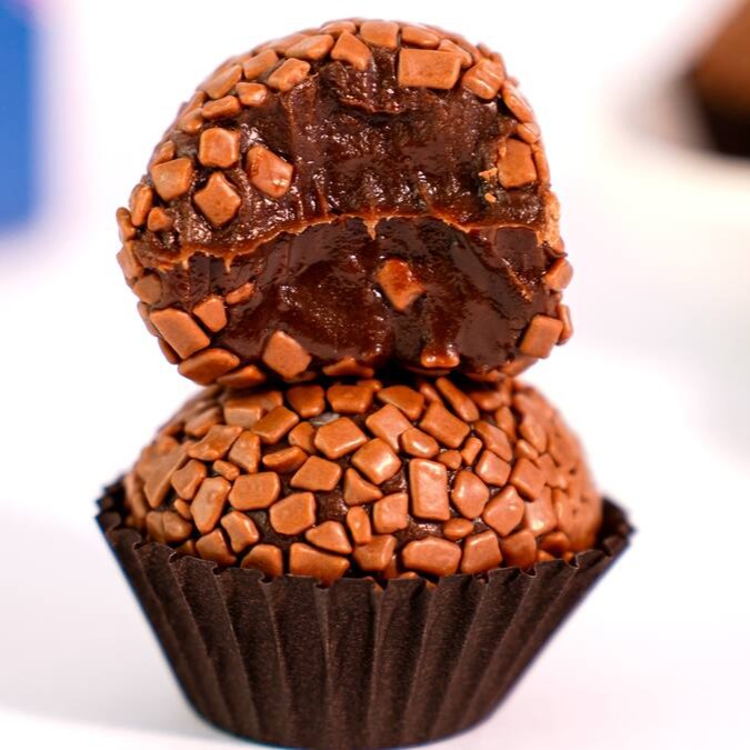 Brigadeiro de chocolate 100% cacau, envolto no granulado Belga
