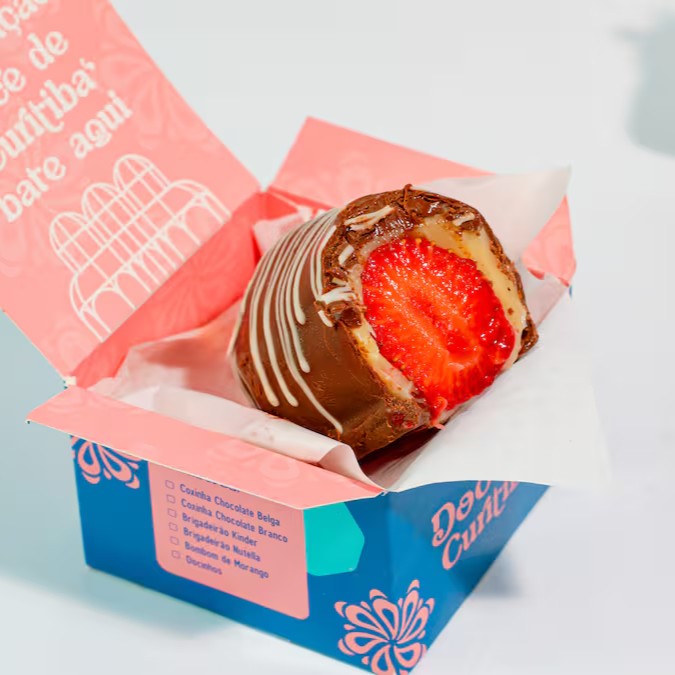 Deliciosa massa de brigadeiro 100% cacau, recheio de morango selecionado, envolto no granulado Belga.