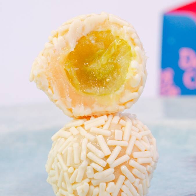 Brigadeiro branco, recheio de uva verde e envolto no granulado de chocolate branco.