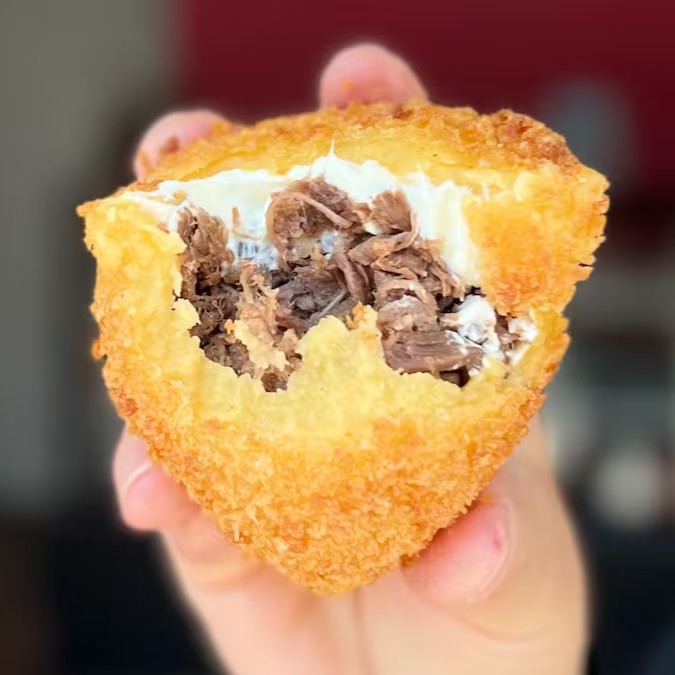 Deliciosa massa a base de batata e trigo, com recheio de Costela com cream cheese, empanado na farinha Panko.