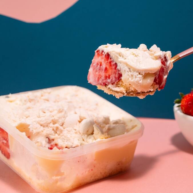 Massa de bolo branco, recheio cremoso de brigadeiro branco com pedaços de morangos selecionados, coberto com creme de nata e suspiro.