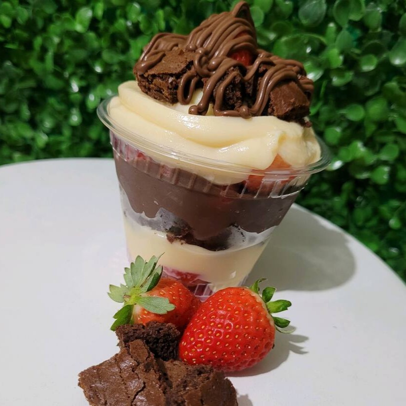 Temos copo dá felicidade com morango fresco, brigadeiro de leite Ninho, brigadeiro preto, brownie e Nutella na decoração