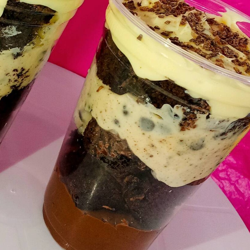 Copo da felicidade de Brownie com brigadeiro de cookies e brigadeiro leite Ninho e avelã