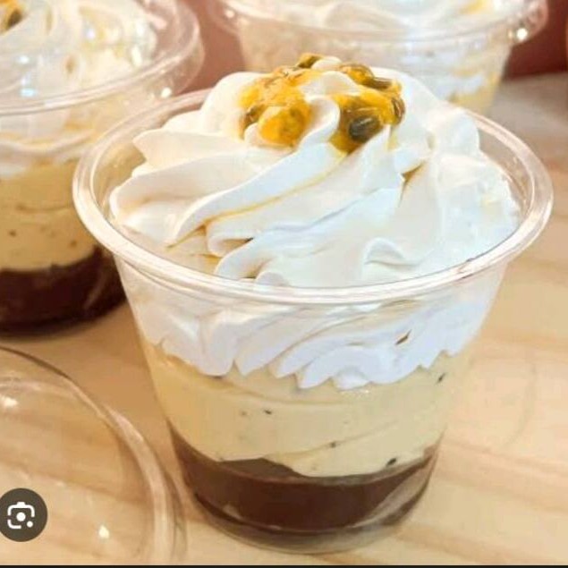 Copo com brownie de chocolate, avelã, mousse de maracujá e chocolate ao leite na finalização!