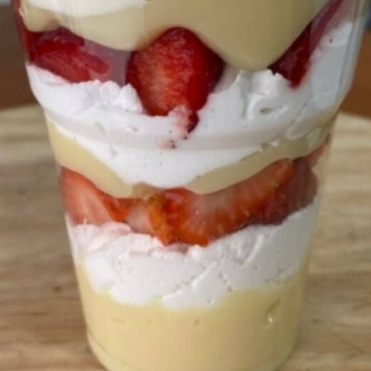 Ganache de chocolate branco, chantilly, morangos picados, chantininho e mais uma camada de chcocolate branco e morangos picados!