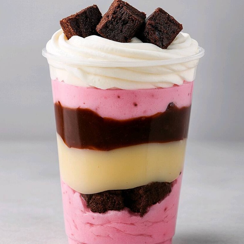 Brownie, ganache de morango, brigadeiro de dois amores e chantilly
