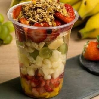 Acompanha, banana, laranja, mamão, maçã, uva verde , uva roxa e manga! Separado acompanha um recipiente com mousse maracuja e granola !