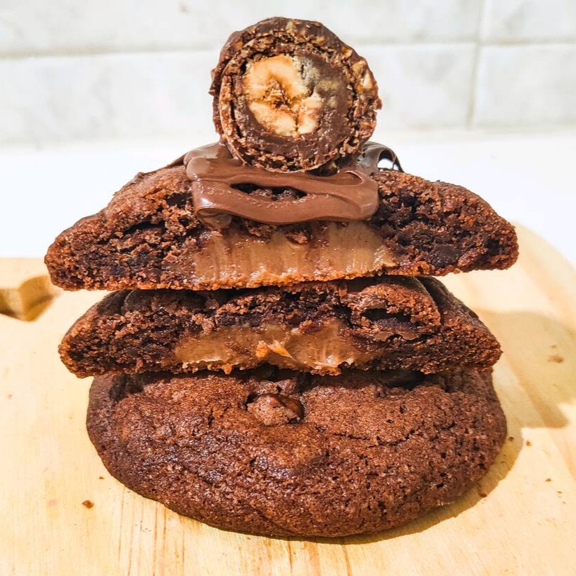 Nosso cookie que já era bom, ficou ainda melhor, super recheado! Nosso cookie de chocolate (quentinho) macio com as bordas crocantes, é recheado com brigadeiro ao leite, gotas de chocolate blend, finalizado com Nutella e ferrero rocher.