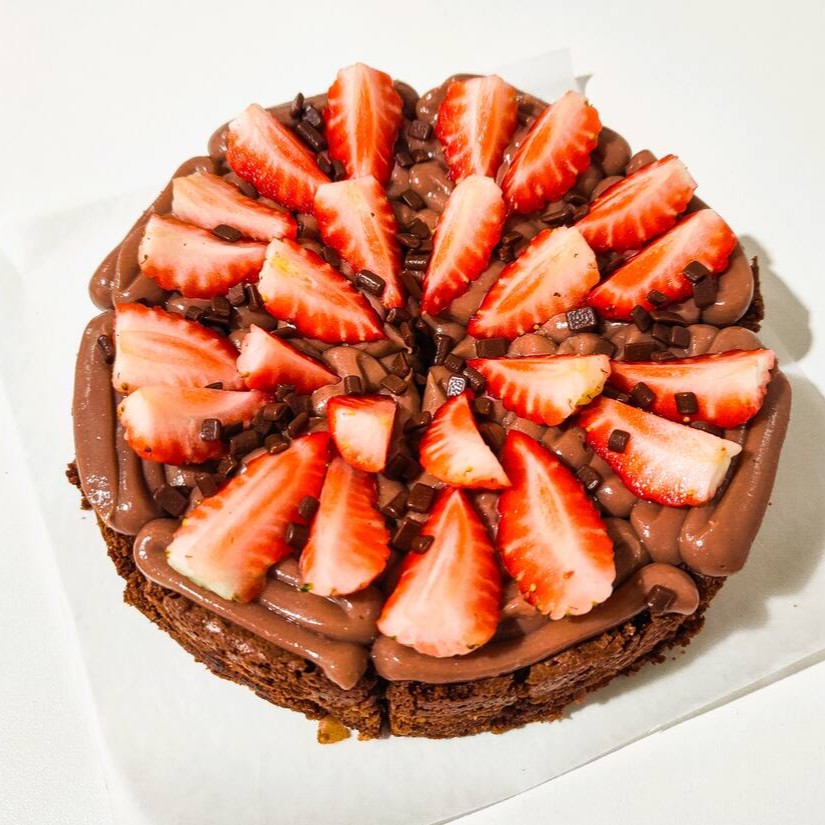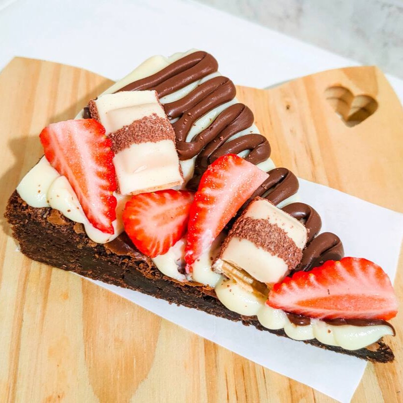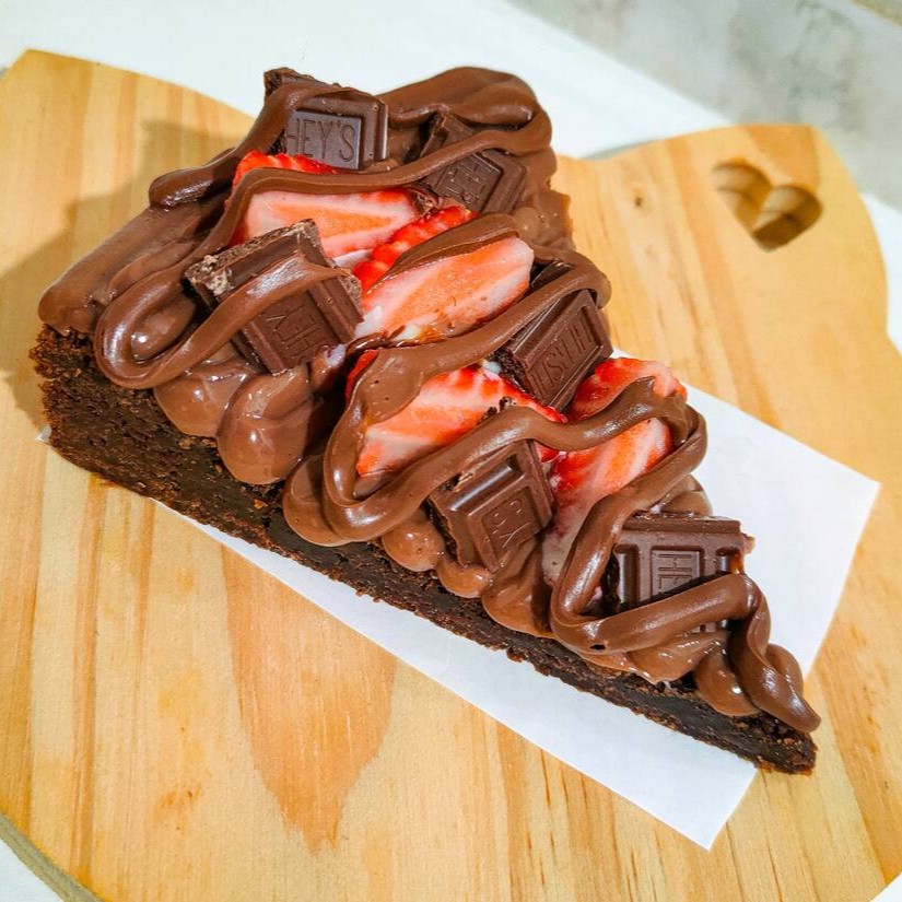 Uma super fatia do nosso brownie chocolatudo, coberto com nosso brigadeiro ao leite cremoso, finalizado com morangos, pedacinhos de Hershey's, e Nutella.
