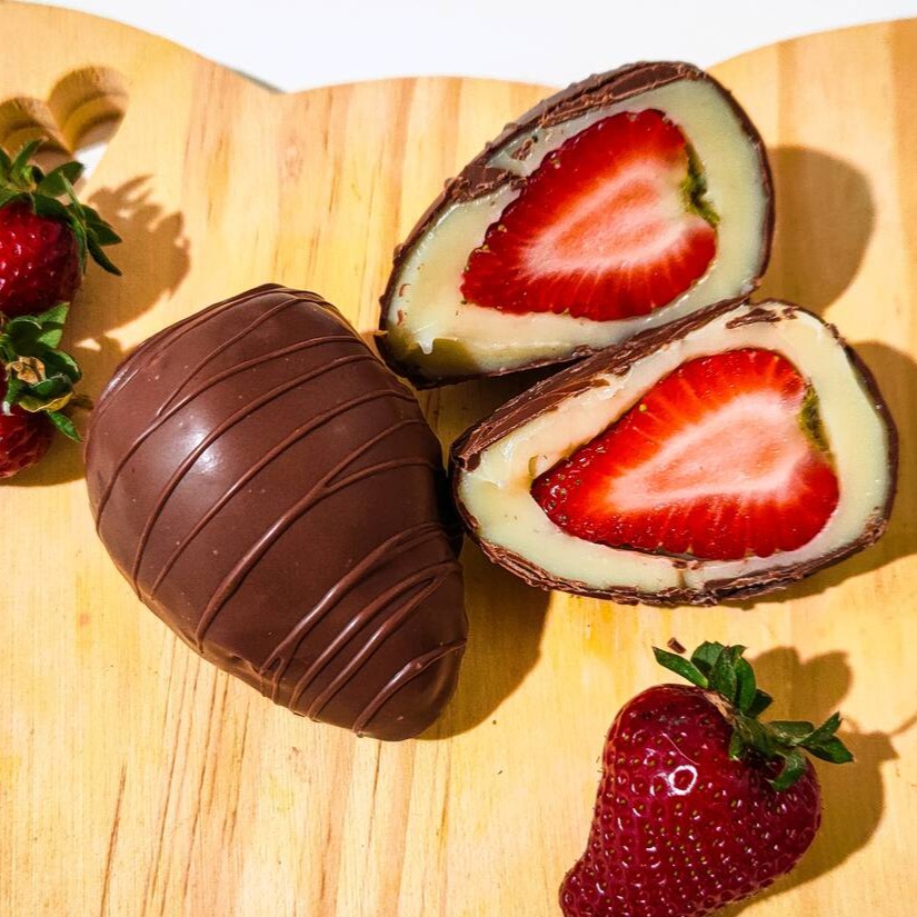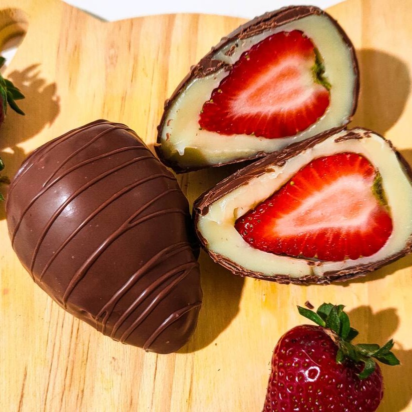 O nosso delicioso bombom de morango chegou! Sendo feito com um brigadeiro branco muito cremoso, envolvido em morango, e banhado com cobertura blend de chocolate. *Contém 1 unidade*