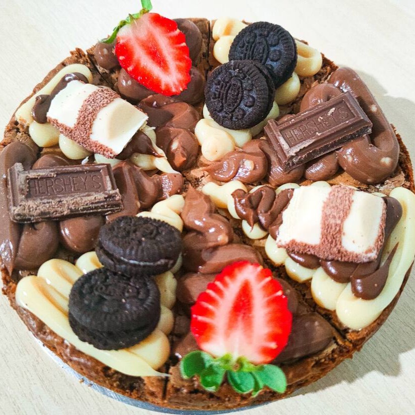 Humm para os amantes de brownie, nossa mini pizza doce, é feita com massa de Brownie chocolate ao leite, sendo 15 cm diâmetro, coberto com brigadeiro de Ninho com Nutella e Kinder bueno(podendo ser branco ou ao leite conforme disponibilidade), brigadeiro ao leite com Hershey's, brigadeiro de Ninho com Oreo, brigadeiro ao leite com morango. Sendo 8 mini fatias. Essa é para os chocolatras, te convido a experimentar.