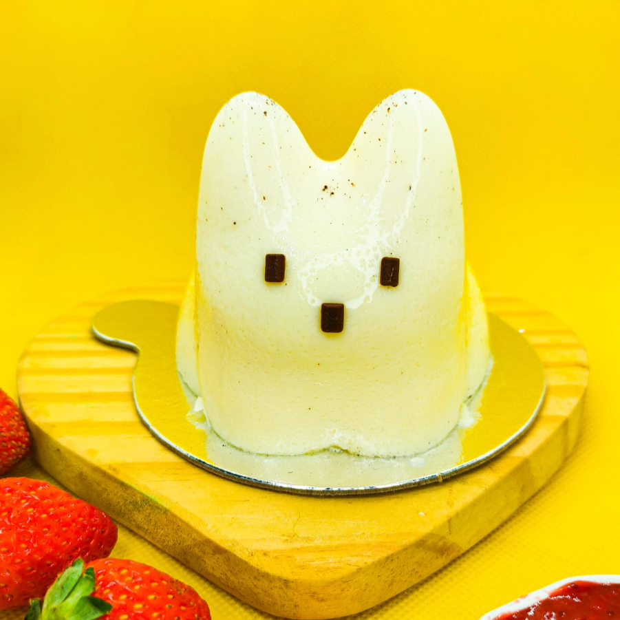 Nosso divertido e delicioso gatinho. É feito em uma cremosa panacotta (parece um puzindinho) de chocolate branco. Acompanha pedacinhos de morango e geleia de frutas vermelhas