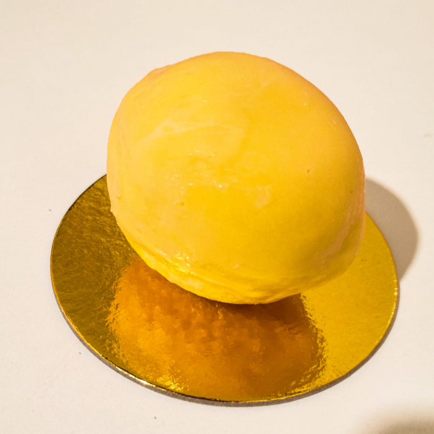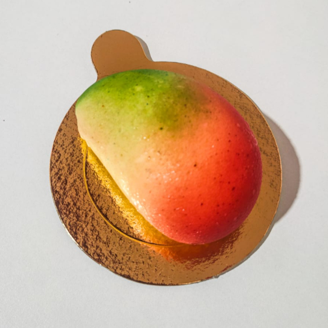 Nosso entremet Manga é muito refrescante e rico em sabor, é a combinação perfeita da manga com maracujá. Sendo feito com uma cremosa ganache de chocolate branco, recheado com uma compota de manga, e um curd de maracujá. Finalizado com uma crocante casquinha de chocolate branco.