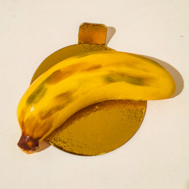 Isso Não É Uma Banana! É o nosso entremet banoffee, é a releitura de um doce clássico brasileiro. Preparado com uma ganache de chocolate branco, intercalado com doce de leite e um cremoso de banana com canela. Finalizado com uma casquinha de chocolate branco.