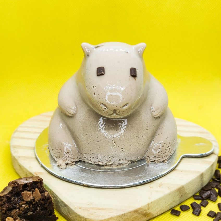 Nossa deliciosa e divertida capivarinha é feita em uma cremosa panacotta (parece um pudinzinho) de chocolate ao leite. Acompanha uma deliciosa ganache meio amargo e pedacinhos de brownie para complementar.
